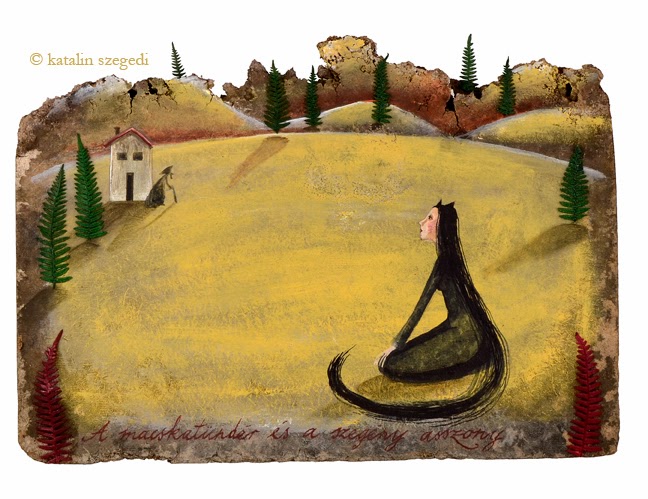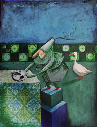 E sorokat olvasva a képzeletembe menthetetlenül belevéste magát egy kép, amit még évekkel ezelőtt festettem. Nem illusztrációnak készült az a kép, nem is jelent meg soha nyomtatásban, és most úgy éreztem, ehhez a meséhez pont jó lenne. Igen ám, de sajnos már nincs meg a kép, és nem is digitalizáltam megfelelően. Így, mivel az olvasott jelenetet már sehogy máshogy nem tudtam elképzelni, mit volt mit tenni, olyat tettem, amit soha nem szoktam: Újrafestettem a képet, csak más színállásban.