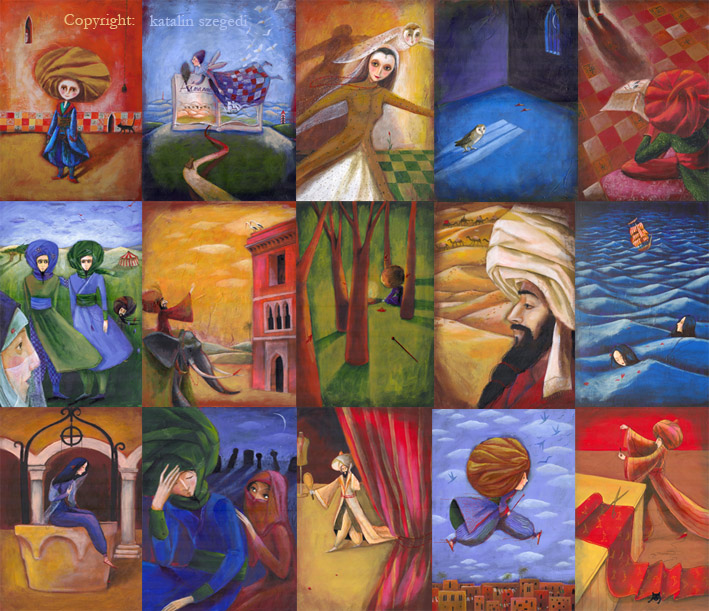 ... A Mese kinyújtotta karját, és különféle jeleket rajzolt a levegőbe. Nyomban tarka képek rajzottak elő: karavánok tevékkel, lovakkal, nyalka lovasok, ... tengerek viharmadarakkal és imbolygó hajókkal...."